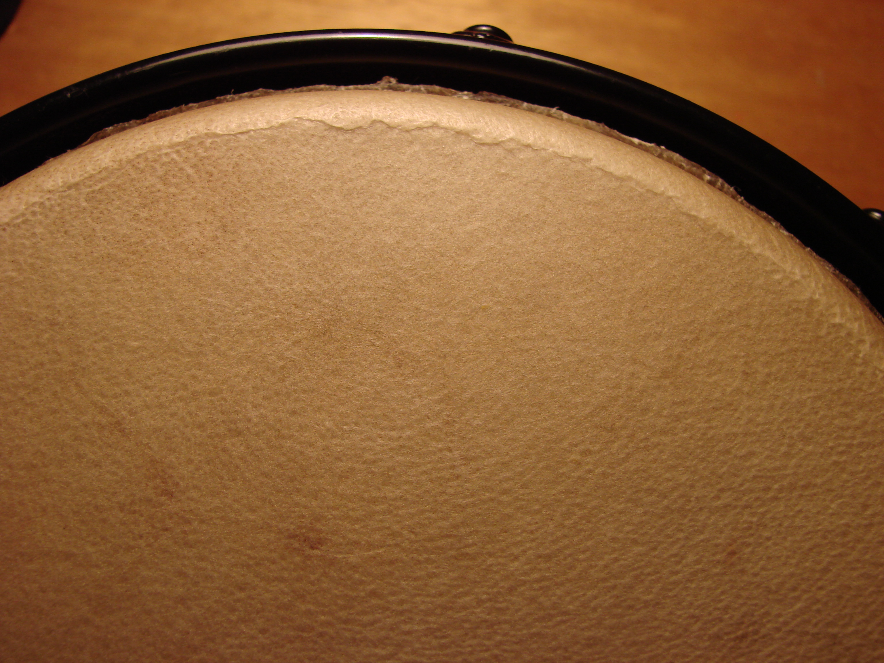 When it is tuned for playing the wrinkle disolves and I it feels smooth to the touch. Also, the underside is smooth, unbroken all around. I keep the drums in their bongo bag in my prctice room with no exposure to the elements, and haven't done anything differently in my routine sonce mounting the new skins. However, three weeks ago, I got the opportunity to play with a renowned percussionist and his band and for that situation he recomended that I tune my Bongos Higher. Since he was trying them out and complimenting the skins, he tuned them himself and they sounded really good in that context. I didn't even need a Mic to be heard in the mix. I mentioned to him that I had never tuned them so high because of playing in accustic, small ensemble settings up to that point and he said that they could take it. Well, two weeks later I notice these, ( I don't want to say cracks ), wrinkles. :(