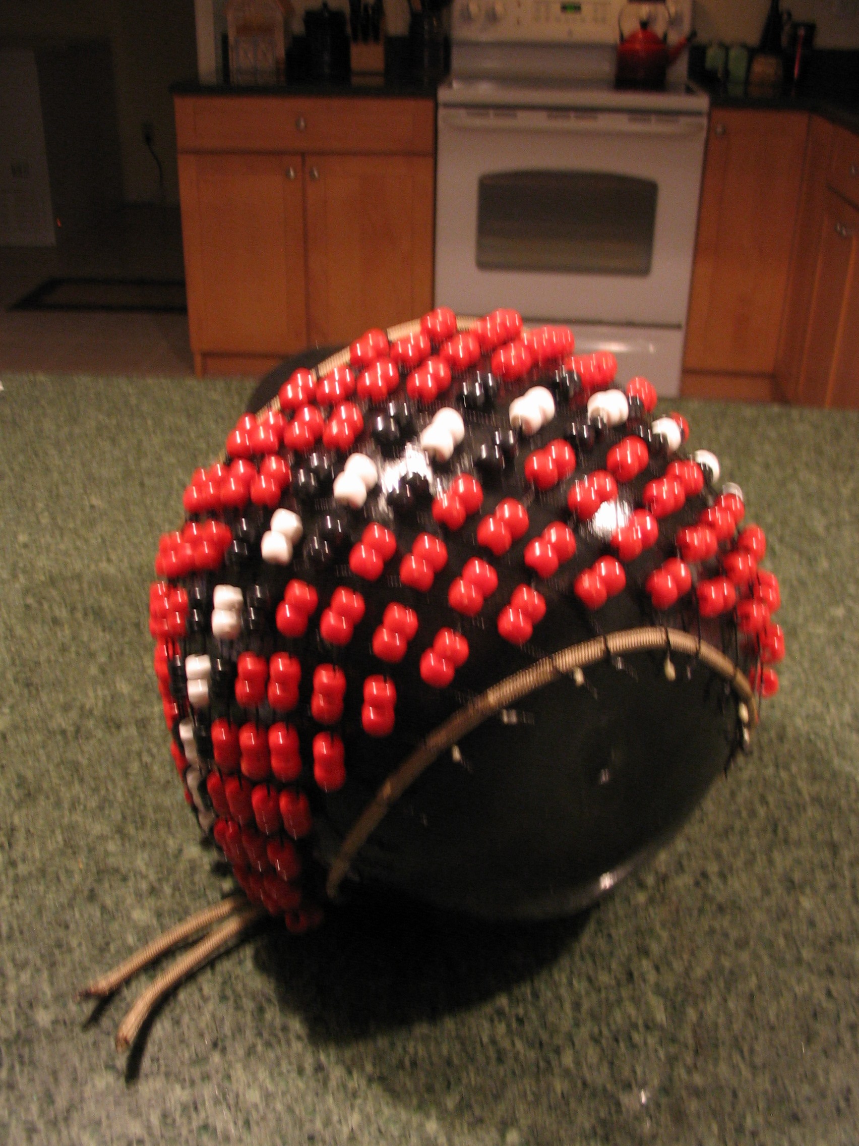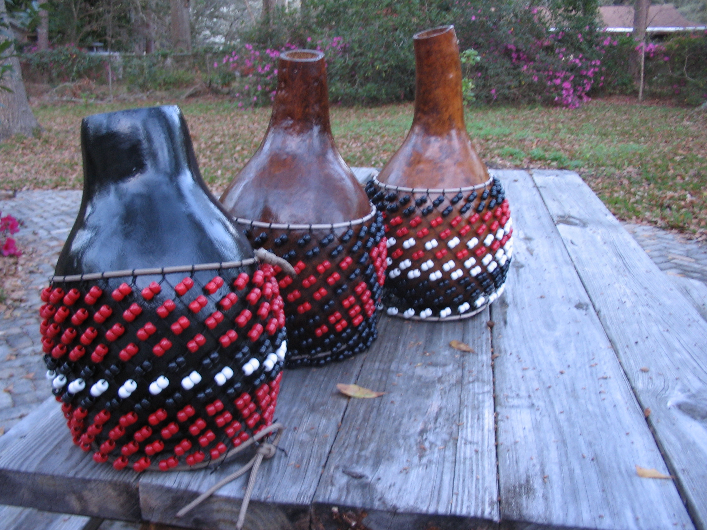 Greetings everyone!!! Well, I'm back to posting shekeres after a flurry of custom orders. This batch represents a different direction from my signature fades and blends. Red, black, and white go well together and create bold eye-catching contrasts so I wanted to create some simple, effective, streamlined designs. These gourds range from 12" - 14" tall and each one is 8" in diameter. My standard rate for these sizes is $45 shpped to forumites in CONUSA. I will combine shipping in case of multiple orders. International customers please contact me separately about shipping options.
