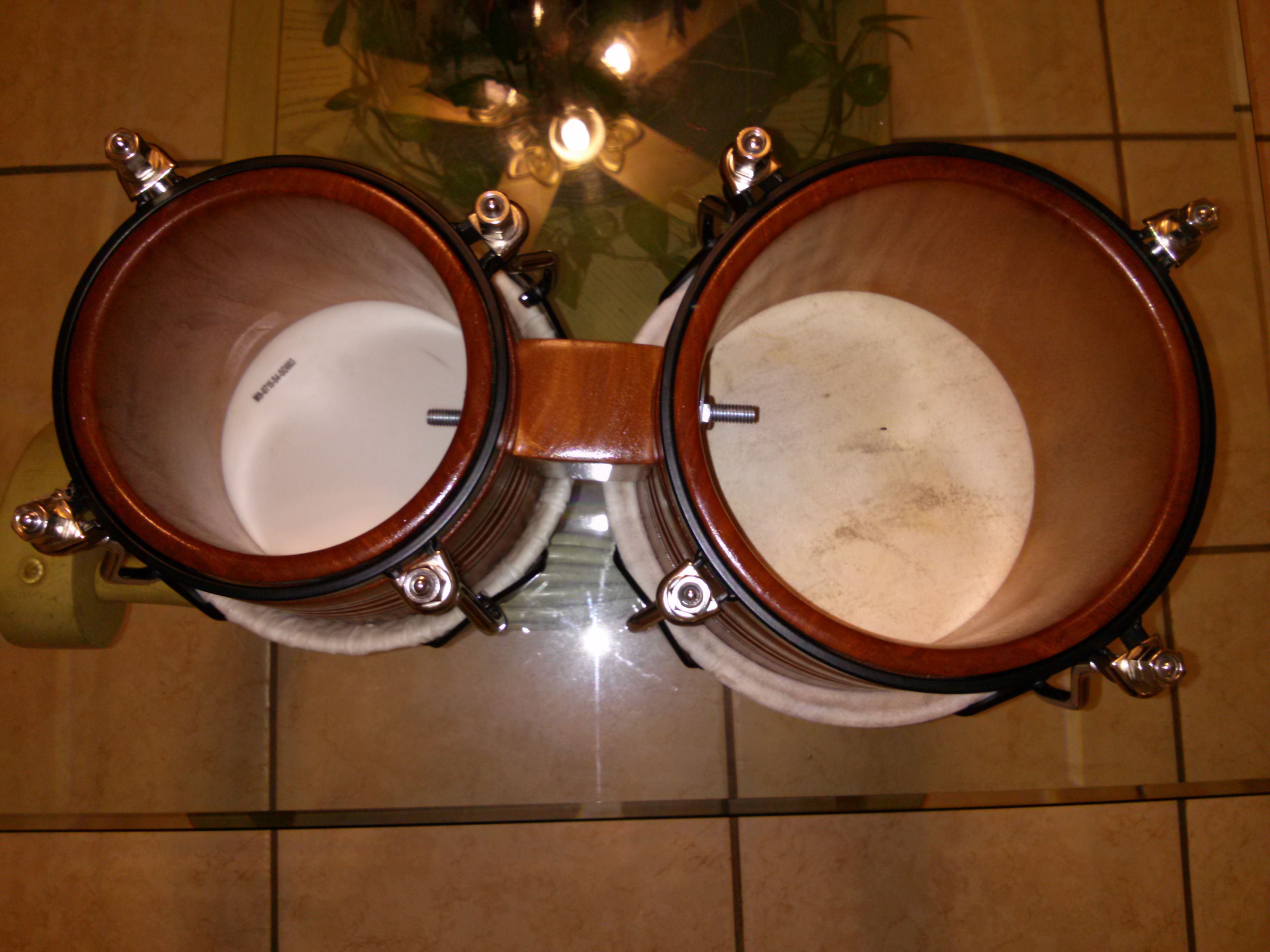 Saludos, just got this new beautiful :D made Bongó by Jorge Miranda of Ponce P.R. Made of one piece solid mahogany( no staves) . Wood thickness is about 3/4" the Macho and 5/8" the hembra. Skins are Remo skindeep & thick cow,the hardware was taken from a Matador custom. Was easier for me to buy a new Matador ($130) and remove the hardware than to make one . If any one is interested I still have the Matador shells for sale. Should be using it tomorrow night at a gig with Conjunto Akangana.