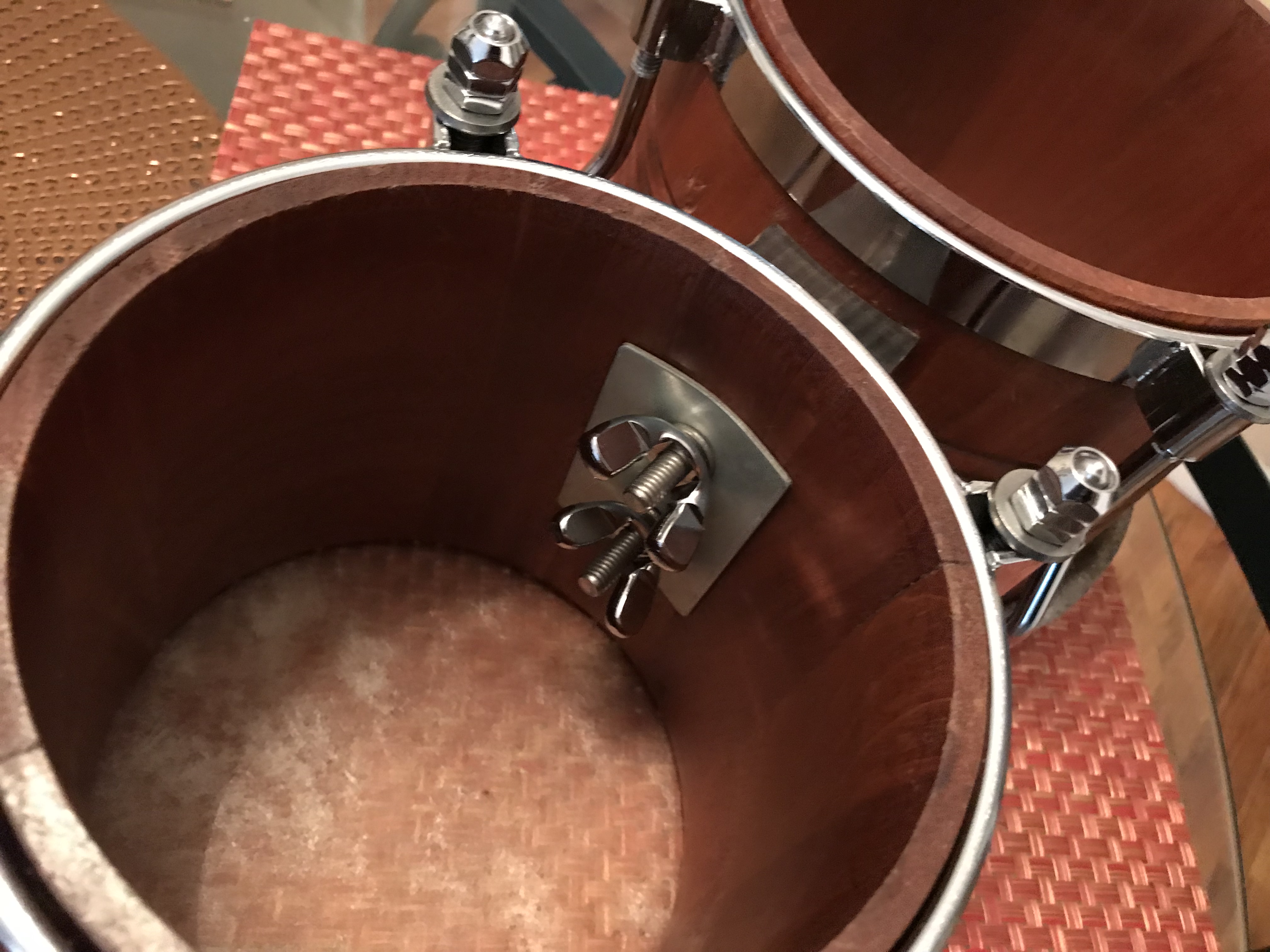 Thanks Juaort. It was made by Jorge Miranda from Ponce P.R of the same wood piece as you can see by the wood pattern. Also it is solid mahogany no staves. I use it most for recording. Yes I also don't like to see an stretched skins on bongos az that make them look cheap. I tune and de tune even if it is synthetic. This other mahogany bongó is also make by the same artisan. He does not makes the hardware.