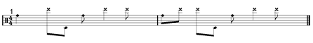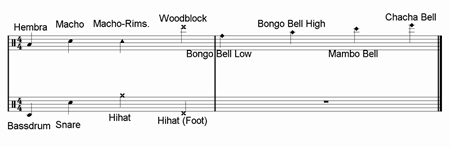 Songo uses a downbeat bell pattern for the right hand and a syncopated