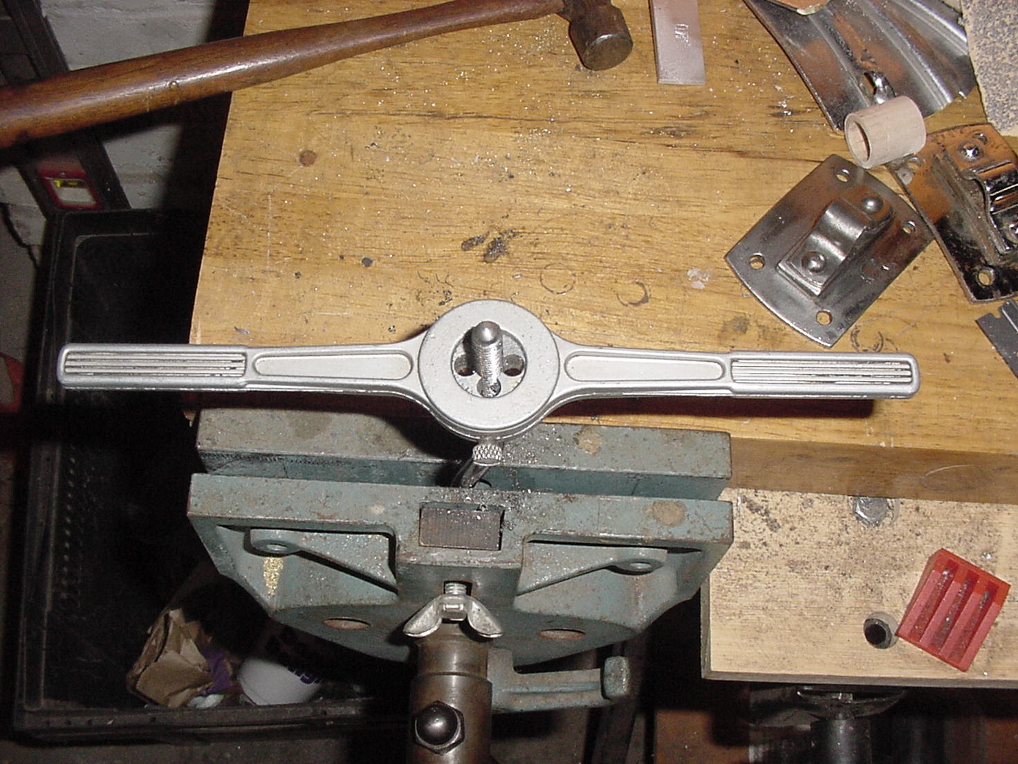 1) First off, you have to strip the shell of hard ware. Examine the lugs for crushed and or bent threads. A bend in the lug can some times be tapped back into alignment, (pics 2-4) but a crushed or stripped thread means you’re in for a wrestling match. Before you start thrashing around with a wrench, trying to untighten the nut, do yourself a favor and turn the drum upside down on its skin, take a 5/16 long nosed socket and a long 3/8 extension ( if you have a socket set) and crank it off this way. You get a lot of leverage fast, and you’ll avoid doing further damage to the shell. If it binds, and snaps off, good, you saved yourself the aggravation of hack sawing off the lug anyway. You may in fact have to cut the lug in half. What you do in this case is shim under the lug with a piece of ¼” thick hardwood or aluminum scrap, ¼” hard thick plastic, long enough and wide enough that will abut under the lug snugly, and protect the surrounding shell of the drum. Wedge 2 cedar shims under the hardwood from either end pressing tight against the shell of the drum. Then CAREFULLY hacksaw it in two.( pic 6) If you have no problem getting the lugs off, it might be a good time to re-chase the threads with a 5/16 thread die.( pic 5) Take down the rest of the hardware and fasteners and put them in a container to the side. We’ll get to cleaning and polishing later.