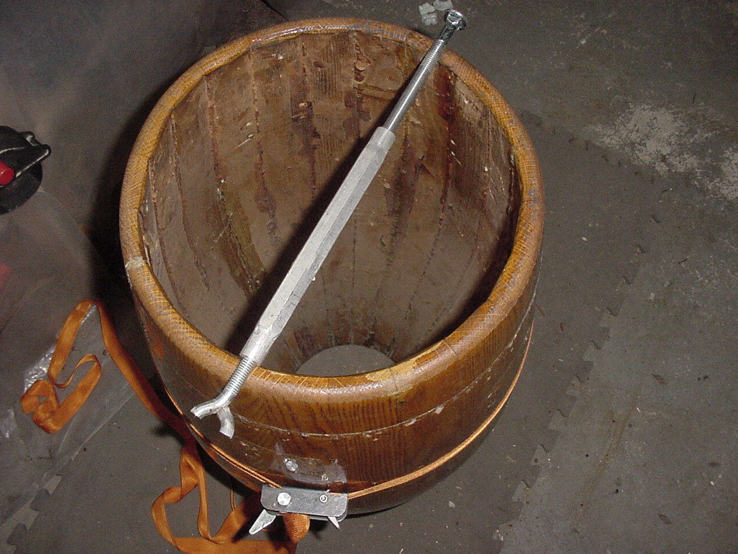 With the drum being restored here, it had a major end to end split, along a stave, that took a set. (It also had 4 more substantial splits and 8 more minor splits). Well how did I determine that it took an off set? By strap clamping the shell dry, I can examine the severity of the set, and manipulate the shell to see how close I can get it back to the original set, I do this with a simple shop made tool made from a turnbuckle.( about $5- 7 bucks in any hardware store) this little devise will solve a lot of problems. (again I devised this tool out of necessity) someone else probably uses something different.