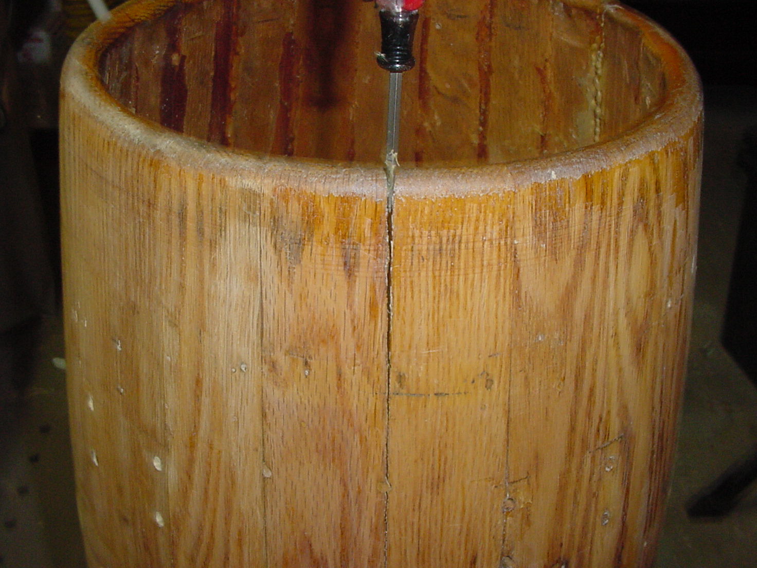 I know from experience and what it will look like when stained after sand down and for my purposes, the PL 400 will work fine, look good, (pic21) (as good as any filler, which I’ll discuss later) and hold the joint together really well. Again, this is my preference in this situation, for my own drum, which is getting a dark stain. It is unconventional, but the joint will not fail. Feel free to do it anyway you want, with what ever works for you. In a different application, where the drum would remain natural oak, I would custom color match an epoxy resin, or disassemble and shave the stave. Which is not a guarantee of perfection either?