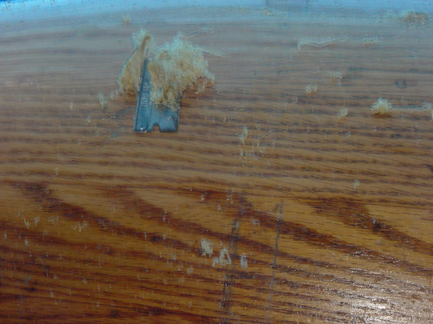 A thing about Oak and sanding grits. Oak comprises what is 98% of ALL hardwood flooring in homes. It is hard, dense, with a lot of pores. 80 grit will sand oak smooth. (100-120 will finish sand it.) Almost all the preliminary sanding can be done with 80. Sand the imperfections until you are satisfied with the result. If all the flaws sand out, you are golden, if you got deep gouges going across grain, you are stuck with them, They will have to be filled and they will show. In this case I had one out of set stave that glued up a little high in one spot.. (about 1/32”) ( pic 34)