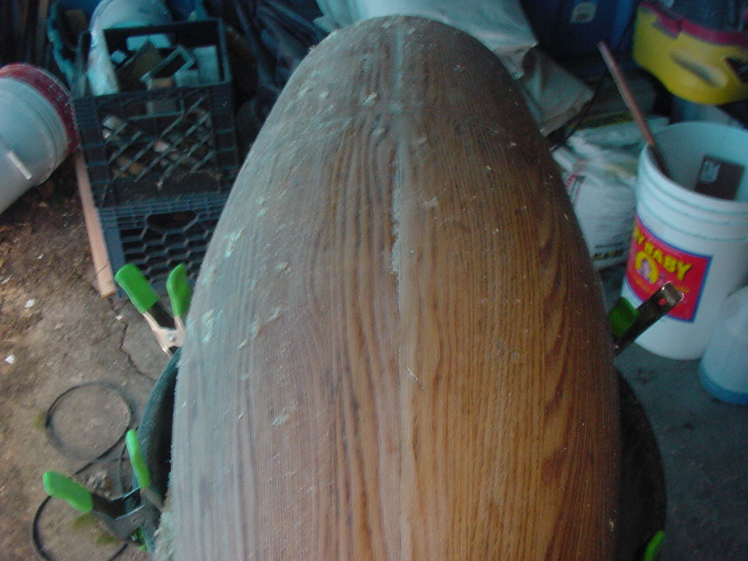 The stripping of the clear coats on a vintage drum is pretty straight forward. What I found to be a very stable holder for any size conga shell is a standard plastic 50 gal garbage pail.( with or without trash, mine has shop trash!) (pic 23) Two scraps of wood and 4 hand clamps. This will form a cradle that will not allow the shell to fall or move. It is all you need.