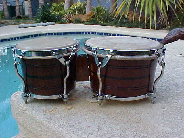 Dandy and I are friends, he called me from Vegas about a year ago and told me that LP was making a signature bongo' for him. It was about time, as Dandy has been the most influential bongocero on the scene for the last 30 yrs. and was Fania's most recorded percussionist both on bongo' and congas. Dandy had as his screen saver on his computer the picture of Mongo's Vergara resting by my pool. He took this photo to the LP research department and told them that he wanted his signature bongo' to look like Mongo's Vergara, which is 7" & 9". LP tried to immitate Mongo's Vergara shells with the black lines. Dandy as a teen had lived in LA and was a friend of Tom Flores, visiting and spending time on his shop. He wanted LP to reproduce the Valje hardware for his bongo', so LP combined the Vergara and the Flores look and came up with Dandy's signature bongos. Enclosed a photo of Mongo's Vergara, notice the similarity on Dandy's shells with the black lines and the Caoba stain.
