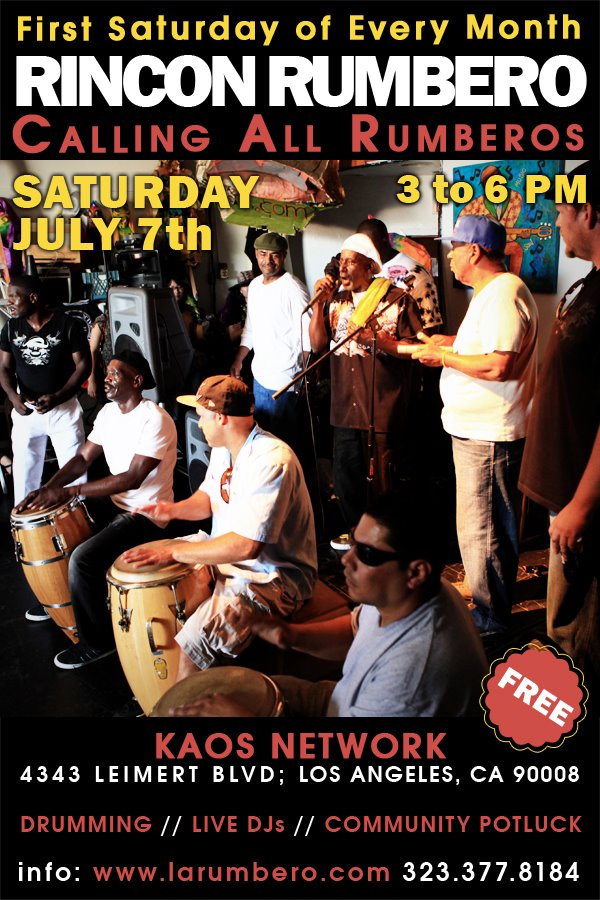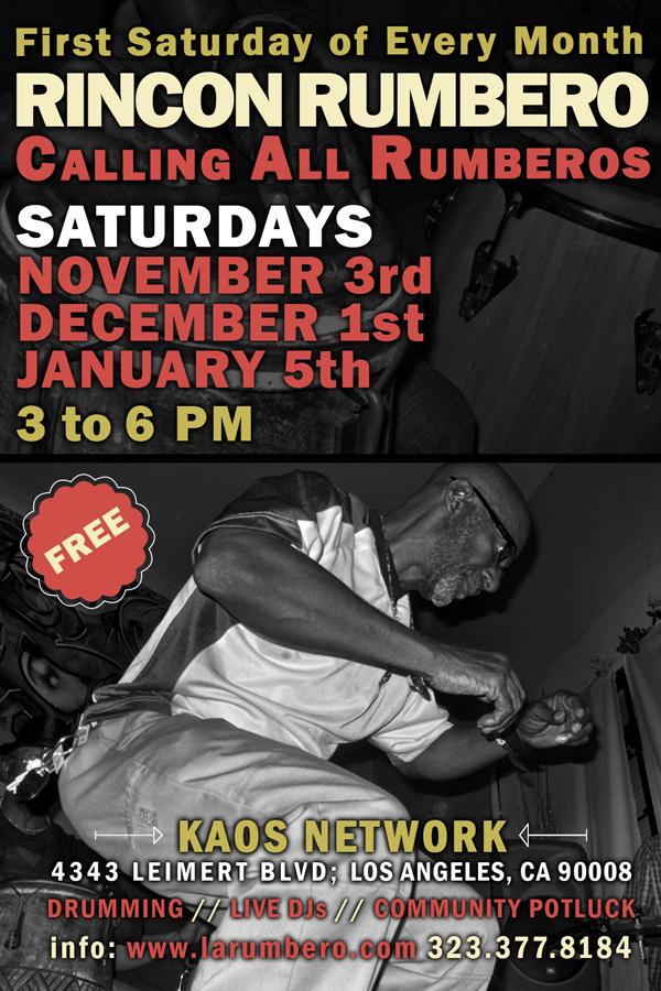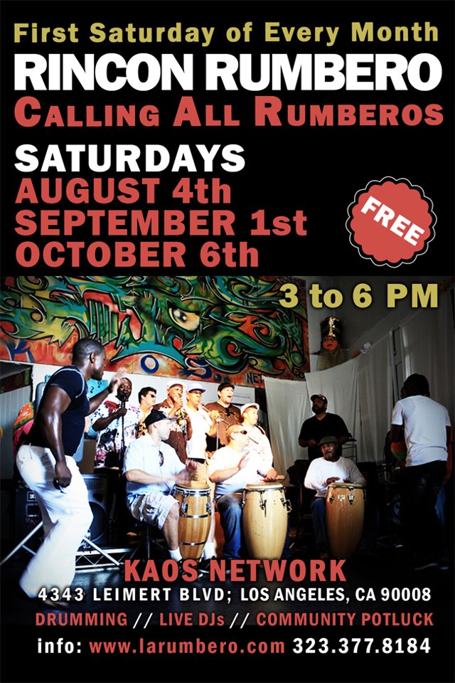 Rincon Rumbero, Los Angeles’ only free and open Afro-Cuban rumba, returns on Saturday, October 6th, 2012 at the KAOS Network in Leimert Park, California.