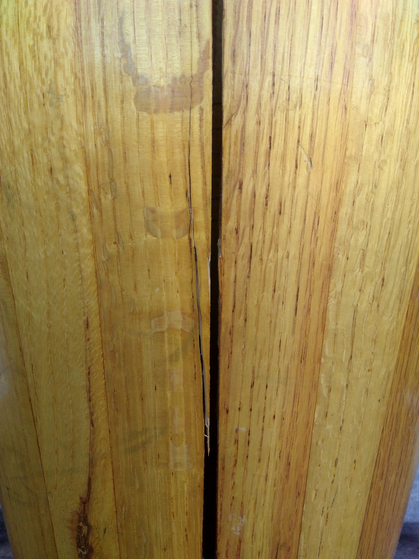 I pried the crack open more with a knife, put a piece of coarse sandpaper in the crack and roughed up the surface of the butt joints between the staves, physically removing any loose or weak glue at the same time. Then I cleaned out the sanding dust with an alcohol soaked rag, let it dry thoroughly and re-glued the staves using Titebond.